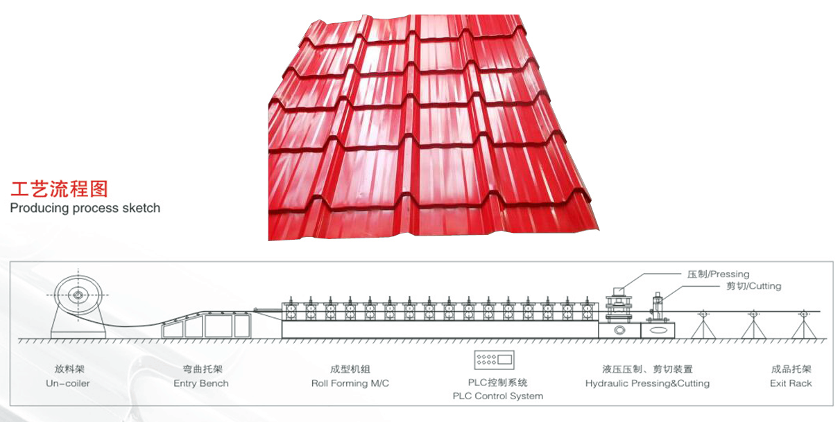 彩鋼琉璃瓦設備主要由放料機、進料導入平臺、成型主機、沖模壓型裝置、成型剪切裝置、液壓站、電腦控制系統(tǒng)、成品托架等幾部分組成。