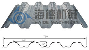 該機生產的鋼樓承板形狀簡潔、波度大、強度高、安裝時鋪置點焊鋼筋網后與混凝土現場澆灌結合,粘合性好。在高層建筑上既可以省去鋼模板又可以減輕樓層承載,在達到同等承受能力的前提下,使工程用鋼量減少,從節省投資。